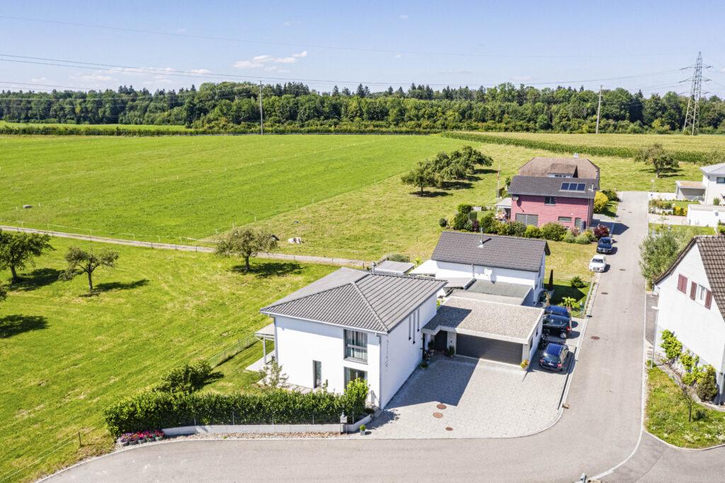 Das freistehende Wohnhaus bei Kreuzlingen vereint naturnahes und unabhängiges Wohnen in einer pflegeleichten Umgebung. Die Wellness-Oase mit finnischer Sauna, Jacuzzi und Swimspa mit Gegenstromanlage sorgen für erholsame Stunden in den eigenen vier Wänden.