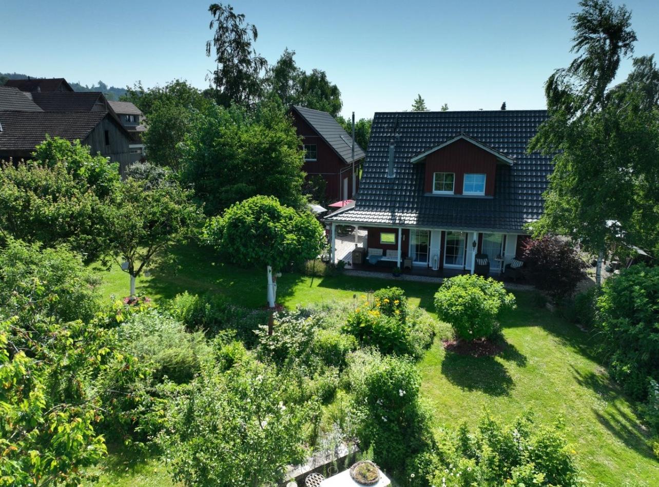 Beheizt wird das Holzhaus im Schwedischen Baustil via Luft-Wärme-Pumpe und über eine Fussbodenheizung.